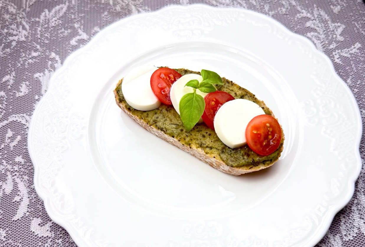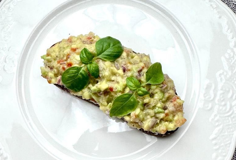 хлеб чесночный, творожный сыр с зеленью, бекон, яйцо перепелиное