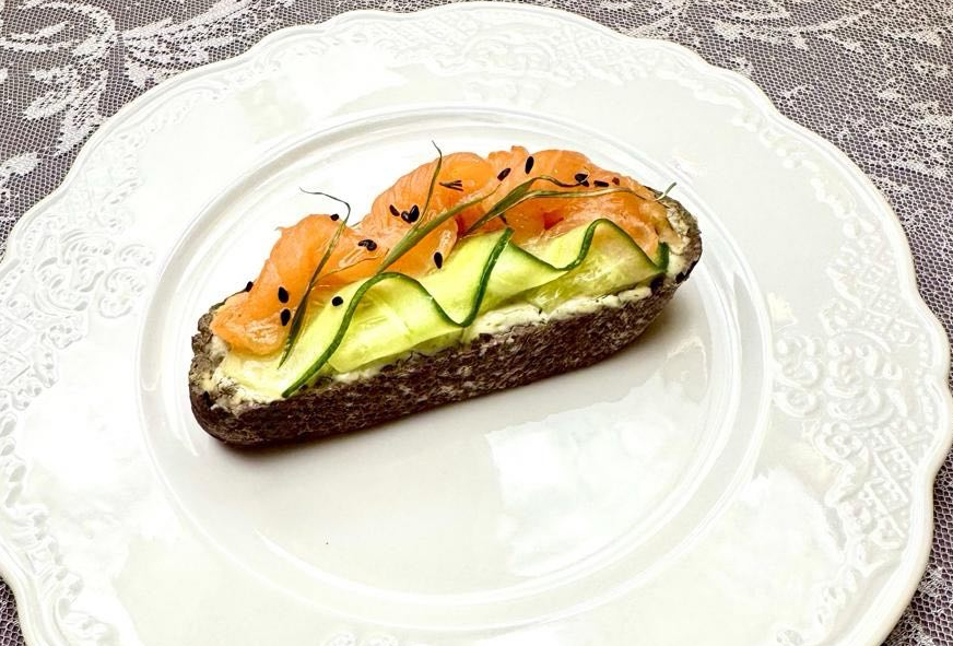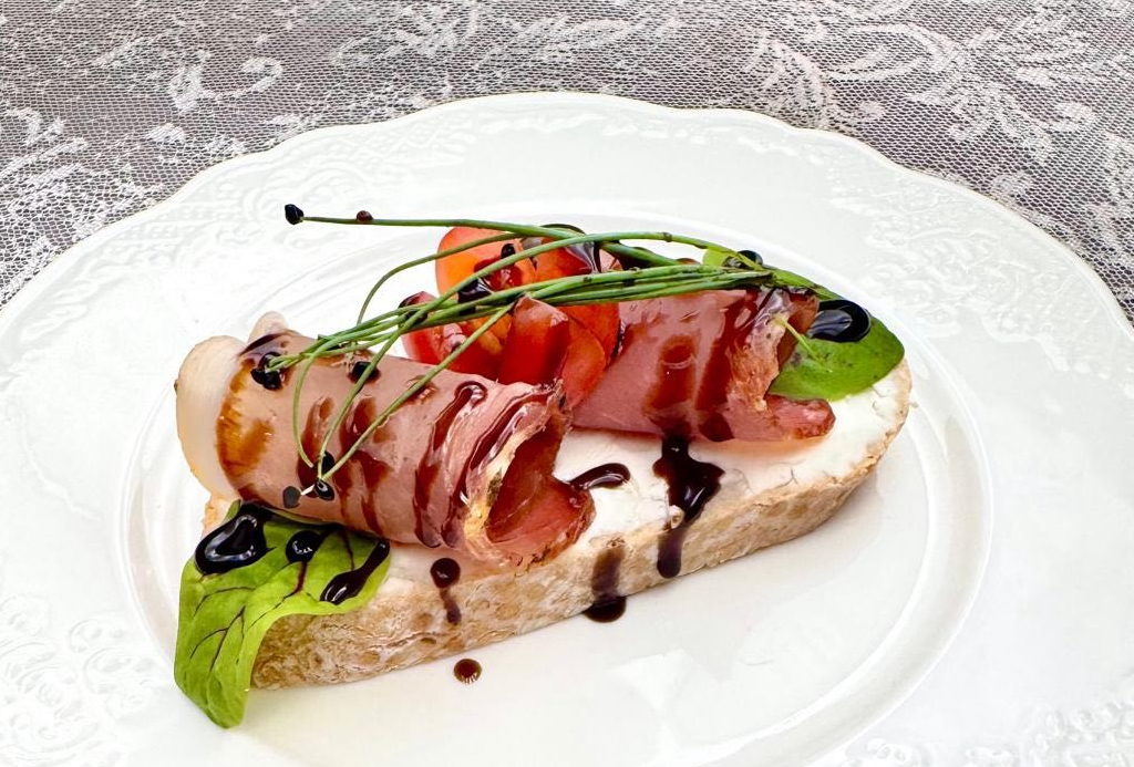 Балык вяленый, сыр творожный, черри, бальзамический соус