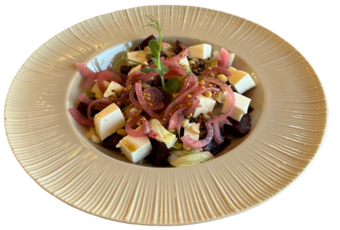Айсберг, свекла, брынза, лук красный, кедровые орешки, зелень, фирменная заправка
