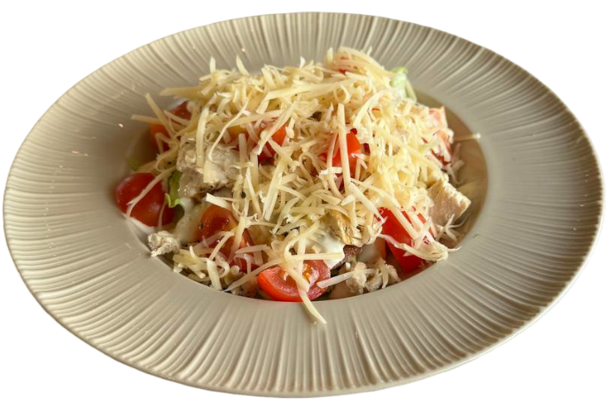 Айсберг, куриное филе, помидорки черри, сыр пармезан, соус цезарь, сухарики